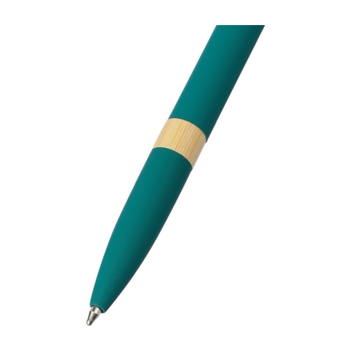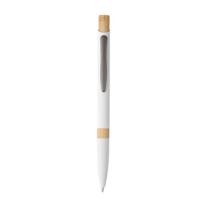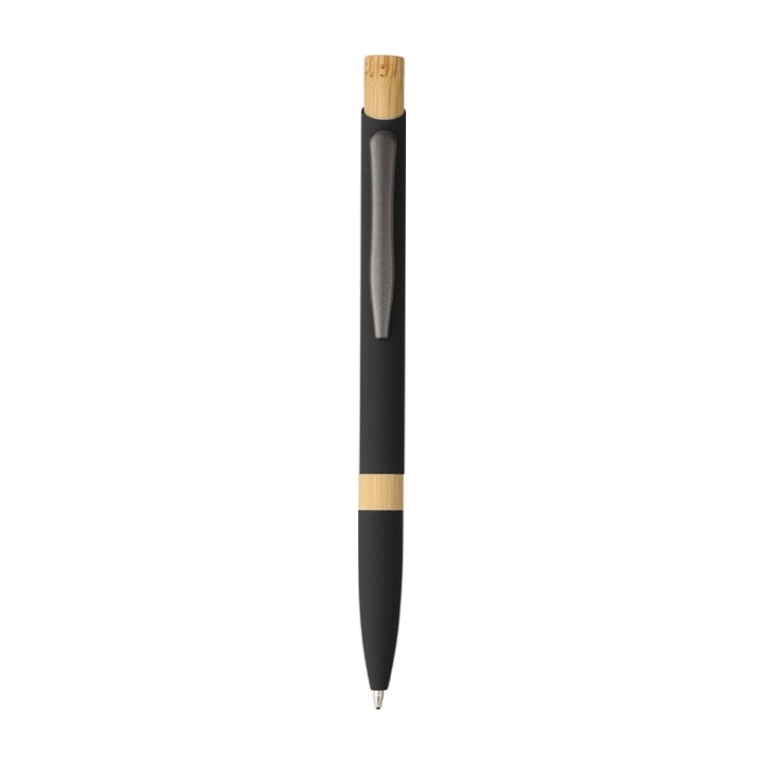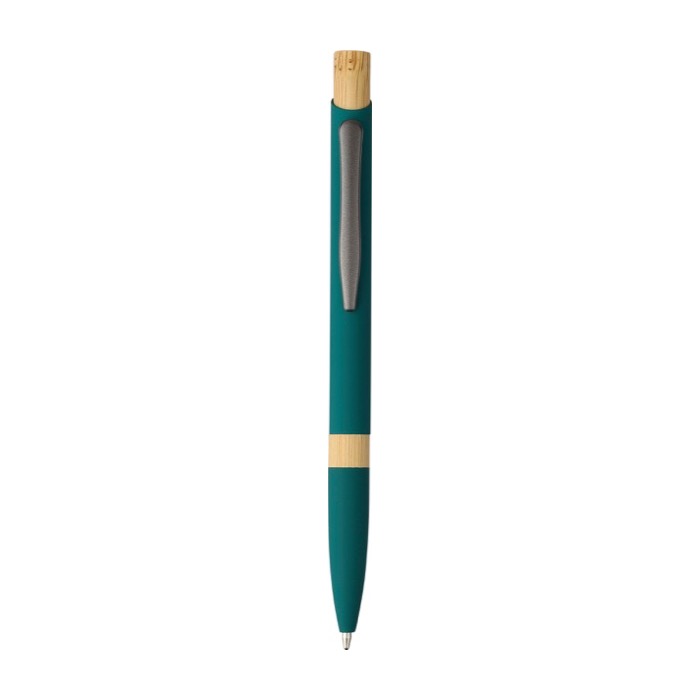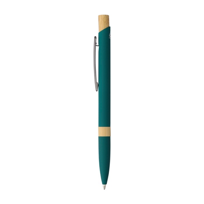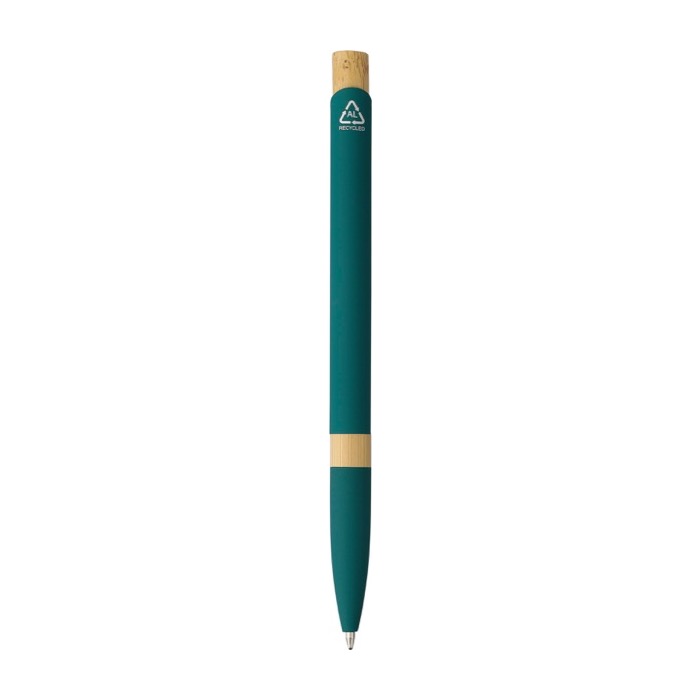 Moderner Kugelschreiber aus recyceltem Aluminium mit gummierter Oberfläche und Bambusdetails. Bietet flüssiges Schreiben mit kräftig blauer Tinte.