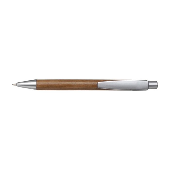 Kugelschreiber aus Bambus, mit Applikationen aus Kunststoff und blauer Mine.