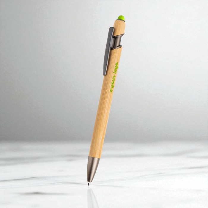 Kugelschreiber mit Bambuskörper und feinen Metallelementen für einen professionellen Auftritt, mit Touchspitze zur einfachen Nutzung von Displays.
