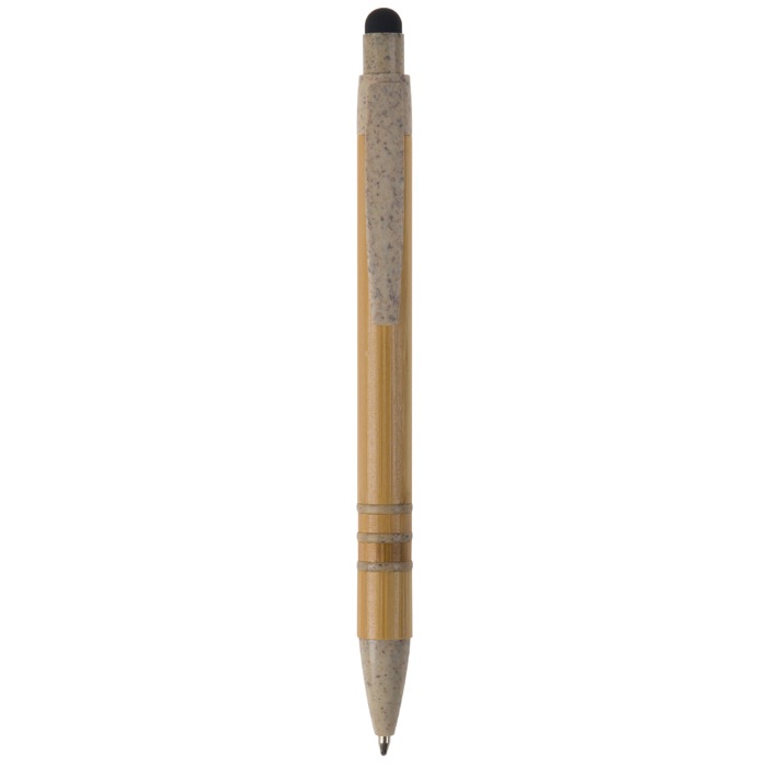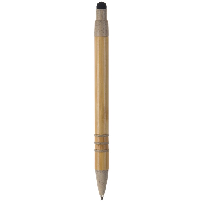 Bambus Kugelschreiber mit Spitze, Clip, Drücker und Ringen am Schaft aus Weizenstroh. Der auf dem Drücker platzierte Touchpen, für die Bedienung von Smartphone-Displays, gibt es in sechs Farben. Ein nachhaltiger und kreativer Werbeartikel zum Verschenken.