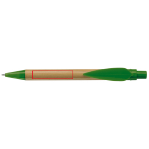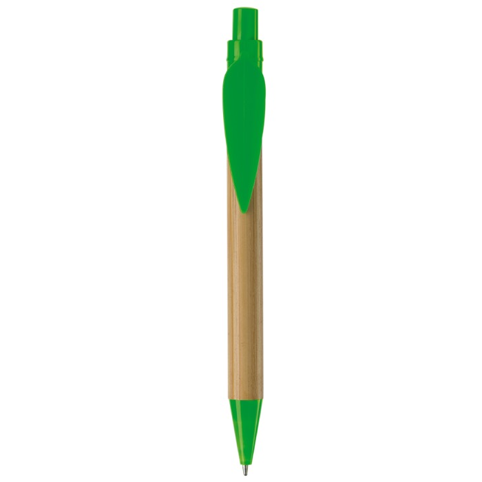 Ökologischer Bambuskugelschreiber mit einem Clip in Blattform. Mit farbigem Drücker, Clip und farbiger Spitze. Schwarzschreibende X20-Mine. Werbeanbringung auf dem Schaft und dem Clip möglich.