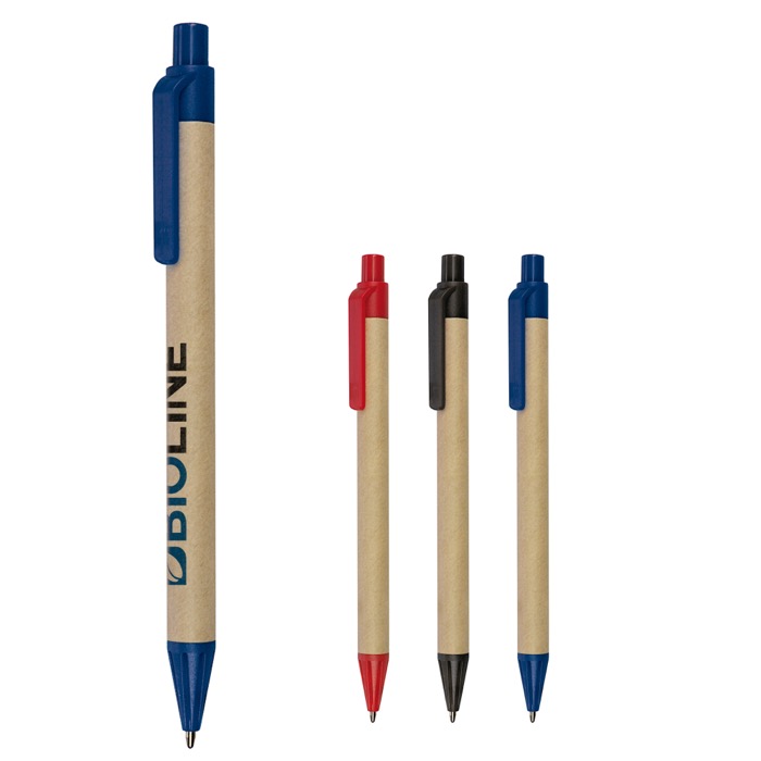 Bio Papierkugelschreiber mit farbigen Clip und Spitze. Blauschreibende X20-Mine.