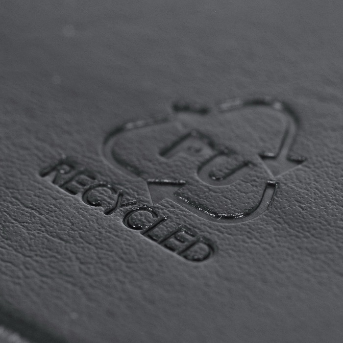 A5-Notizblock mit harten Einbänden und angenehm weicher Haptik, gefertigt aus recyceltem Kunstleder und recyceltem Kunststoff. Er verfügt über Lesezeichenbänder in drei Farben (Schwarz, Rot und Grau) zur Gliederung von Abschnitten sowie über ein passendes doppeltes Elastikverschlussband. Die Weißen linierten Seiten erleichtern das tägliche Schreiben, und die innere Papiertasche hilft beim Aufbewahren von losen Notizen oder Karten. Eine praktische Option für Planung, Meetings und Markenaktionen im Büro oder bei Unternehmensveranstaltungen.