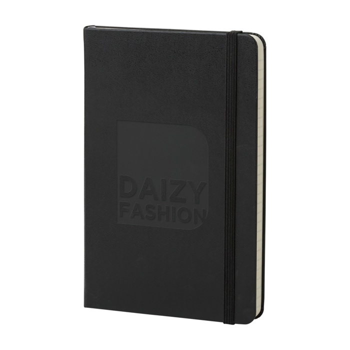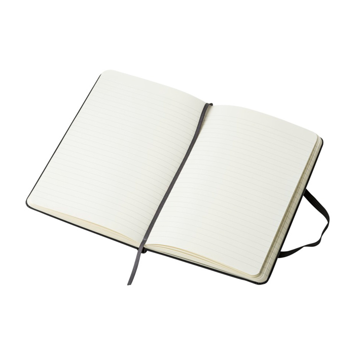 Notizbuch mit hartem Kartoneinband und widerstandsfähiger Oberfläche im mittleren Format für den täglichen Einsatz. Es verfügt über abgerundete Ecken, einen Elastikverschluss und ein Lesezeichenband, damit Sie Notizen schnell wiederfinden. Im Inneren bietet es 208 linierte Seiten auf elfenbeinfarbenem Papier, ideal für Meetings, Termine oder Außeneinsätze. Enthält eine erweiterbare Innentasche zur Aufbewahrung von Karten, Belegen oder losen Dokumenten. Mit Zertifizierung für nachhaltige Forstwirtschaft. Ideal als Unternehmensgeschenk für Schulungen, Onboarding oder Veranstaltungen mit Branding.