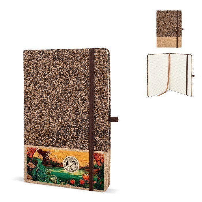 A5-Notizbuch mit exklusivem Einband aus Kork und gemahlenem Kaffee. Mit Gummibandverschluss, Stifthalterung und Lesezeichenband. Enthält 80 cremefarbene linierte Blätter aus FSC-zertifiziertem Papier. Eine natürliche und unverwechselbare Wahl.