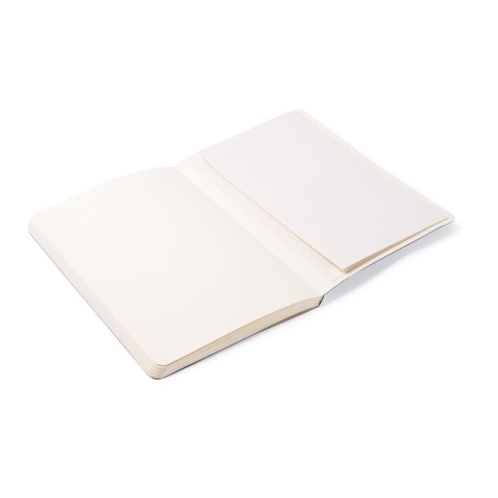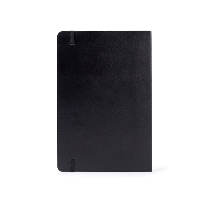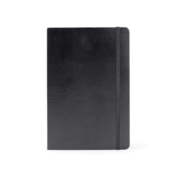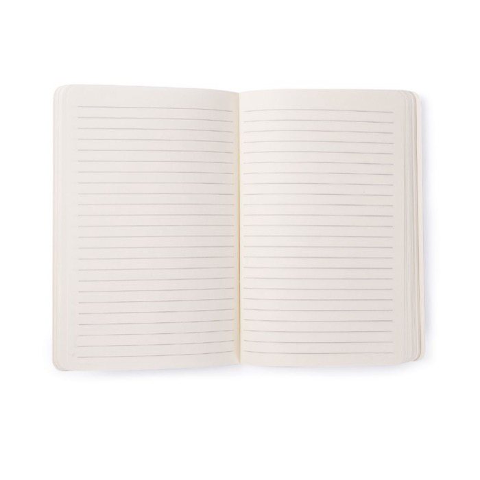A5-Notizbuch mit flexiblem PU-Einband, 96 linierte Seiten auf cremefarbenem Papier, 70 g/m², Innenfach und Gummibandverschluss.