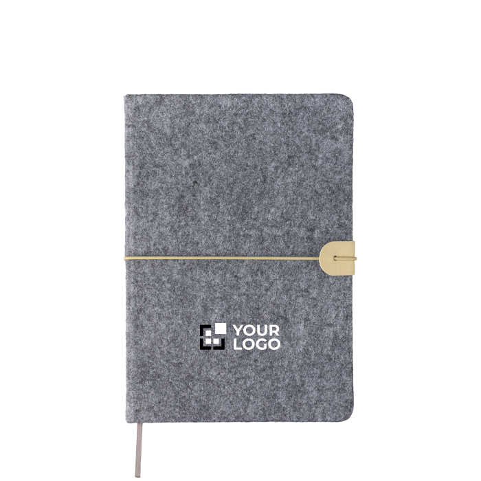 Notizbuch aus recyceltem Filz (ca. A5) mit flexiblem 1-mm-Cover, Gummiband und PU-Verschluss außen. Mit Lesezeichenband und 80 linierten Seiten (70 g/m²). Lasergraviertes Recyclinglogo auf der Rückseite