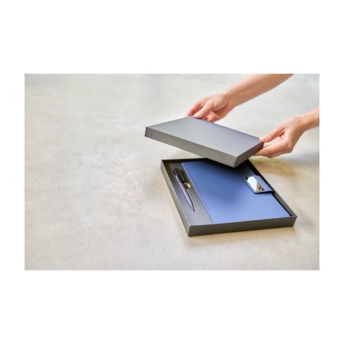 Geschenkset in Kartonbox mit Drehkugelschreiber aus recyceltem Aluminium (blaue Tinte) und Notizbuch aus recyceltem PU (A5) mit 80 linierten Seiten FSC-Papier (70 g/m²), Lesezeichenband und magnetischem Metallverschluss mit Gravurplatte in Grau. Logos: Thermoprägung auf dem Notizbuch, Lasergravur auf dem Kugelschreiber
