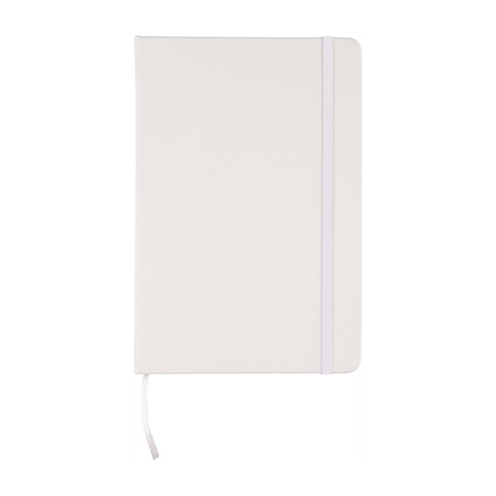 Notizbuch aus RPET (ca. A5) mit Hardcover aus RPET-PU, 80 linierte Seiten (70 g/m²), Gummiband und passendem Lesezeichenband. Mit geprägtem Recycling-Logo auf der Rückseite