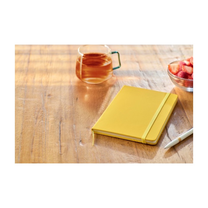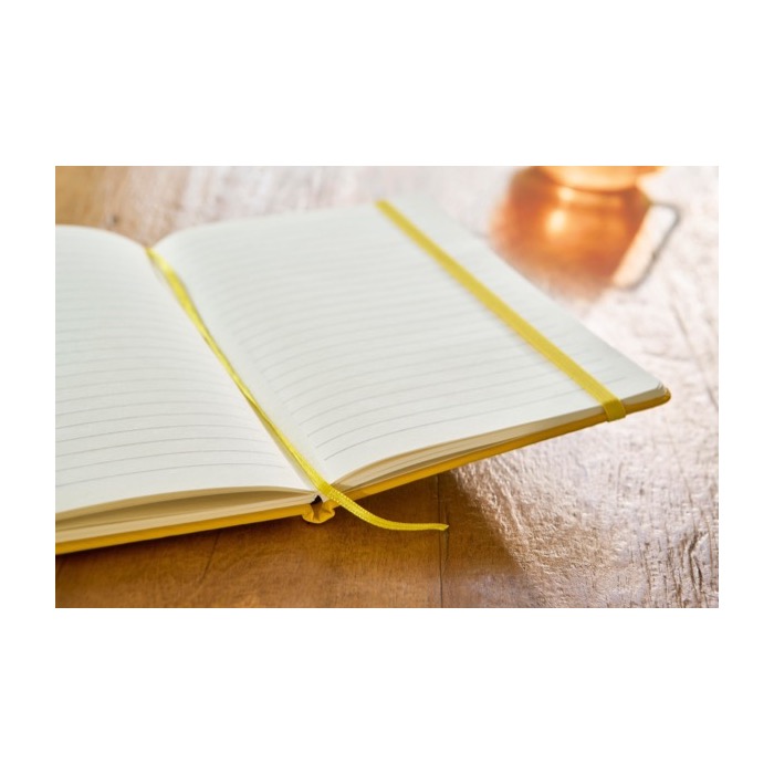 RPET Notizbuch mit Hardcover, linierten Seiten, Gummiband und Lesezeichen in passender Farbe. Nachhaltig und ideal zur Personalisierung mit deinem Logo.