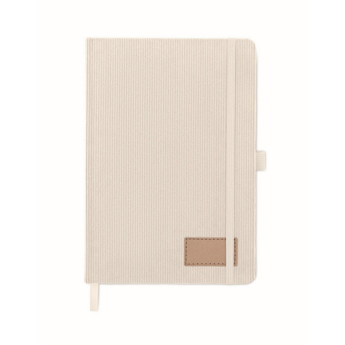 A5-Notizbuch mit festem RPET-Polyester-Cordbezug und Hardcover-Design für den täglichen Einsatz im Büro oder bei Kundenterminen. Es umfasst 192 Seiten liniertes Recyclingpapier (70 g/m²), ideal für geordnete Notizen in Meetings und Schulungen. Mit Gummiband zum Verschließen und Lesezeichenband, um den letzten Eintrag schnell wiederzufinden. Das Etikett aus gewaschenem Kraftpapier sorgt für ein dezentes Finish. Praktische Option für Willkommens-Kits, Events und Markenaktionen.