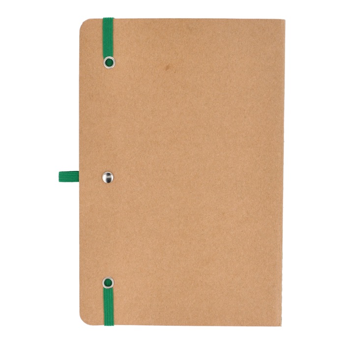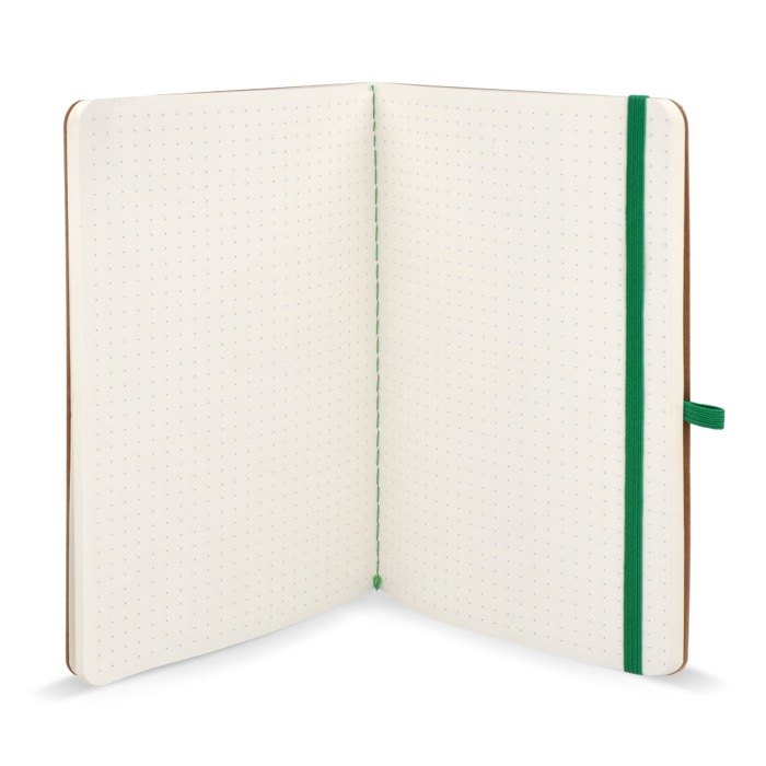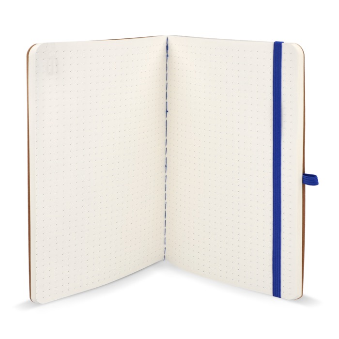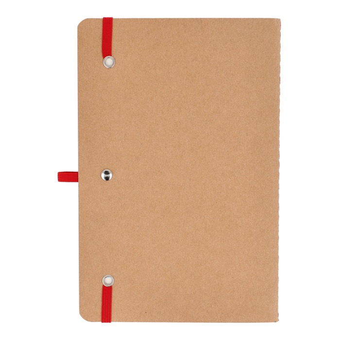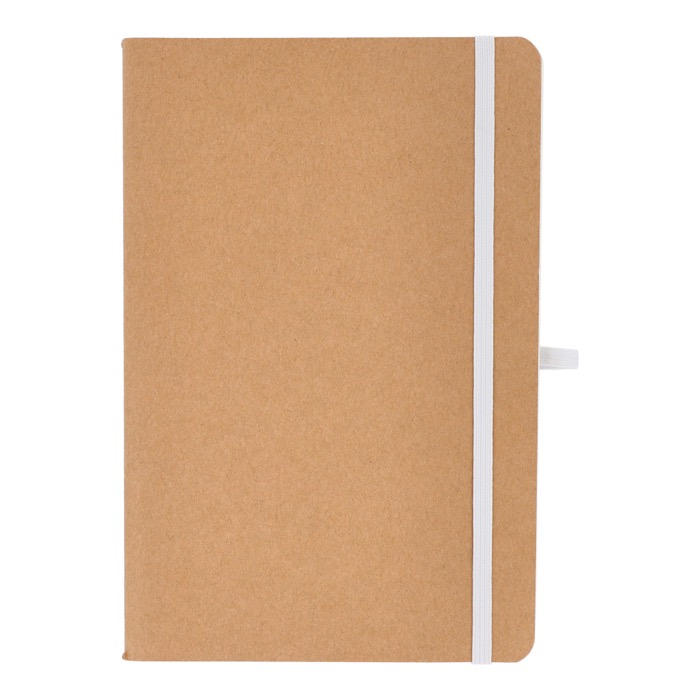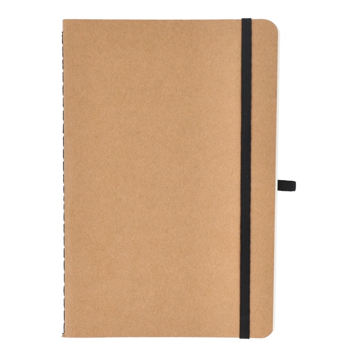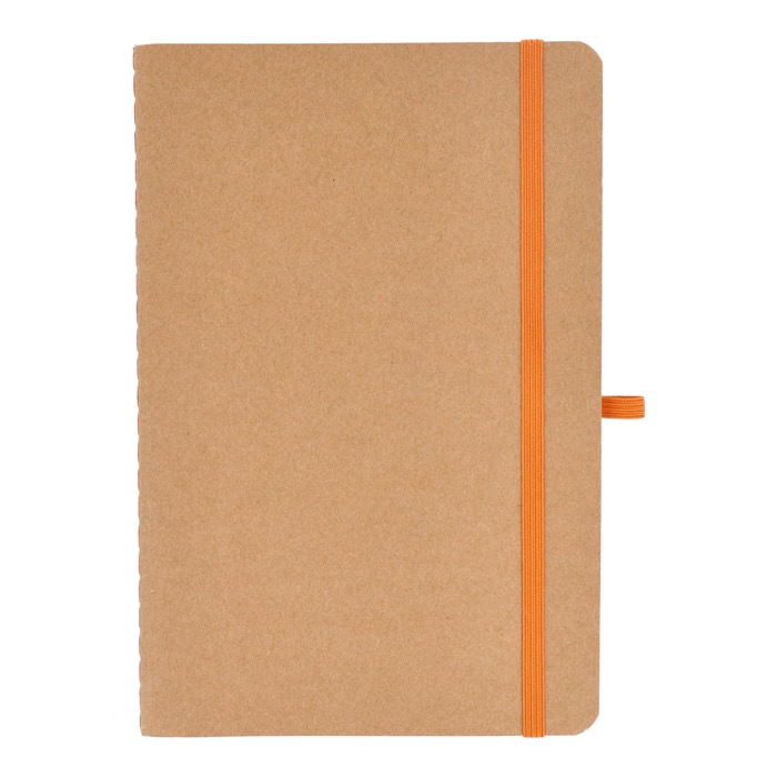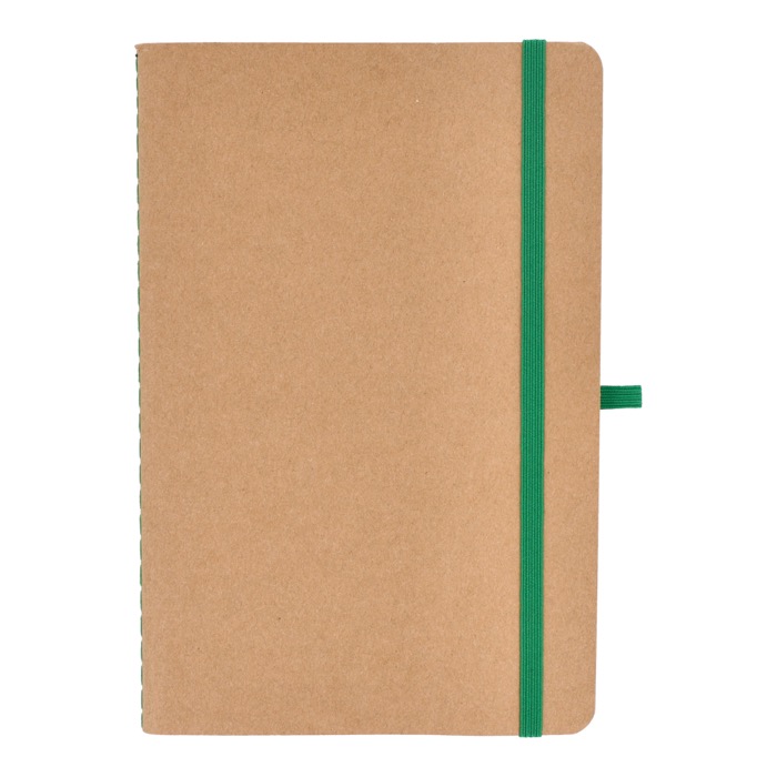 A5 Notizbuch mit weichem Umschlag aus Kraftpapier, abgerundeten Ecken, farbigem Gummibandverschluss und Stiftschlaufe. Es enthält 60 linierte Seiten in cremefarbenem Papier mit FSC Zertifizierung. Eine praktische und natürlich wirkende Wahl für tägliche Notizen.