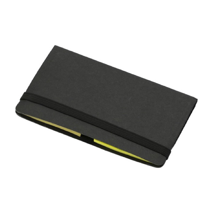 Haftnotizen aus Karton mit Visitenkarten-Einsteckfach, 25 Haftnotizstreifen in 5 Farben und Haftnotizzettel, inklusive Gummiverschlussband.
