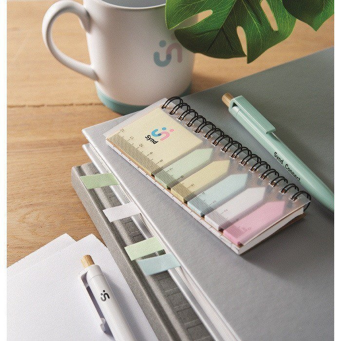 Notiz-Set mit Ringen aus PP, das einen Haftnotizblock und 5 farblich assortierte Lesezeichen aus Recyclingpapier enthält. Kompaktes Format zum Mitnehmen in Handtasche, Rucksack oder Aktentasche, damit Erinnerungen, Markierungen und schnelle Notizen stets griffbereit sind. Die Ringe helfen, das Set ordentlich zu halten, und erleichtern die Nutzung bei Meetings oder Besuchen. Praktische Option für Büroaktionen, Firmenveranstaltungen oder Willkommenspakete.