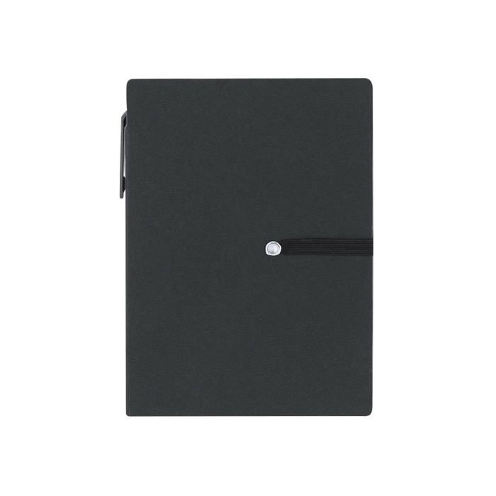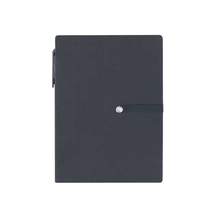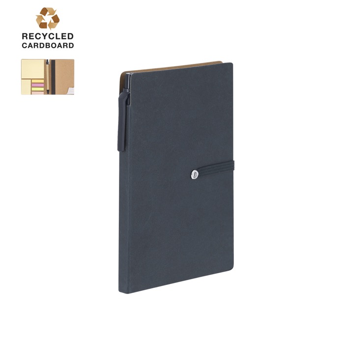 A6-Block aus recyceltem Karton mit hartem Einband und Verschluss durch ein passendes Elastikband. Enthält einen Block mit 70 Weißen, liniert angelegten Blättern, damit Sie Ihre täglichen Notizen ordentlich festhalten. In der inneren Umschlagseite befinden sich gelbe Haftnotizen in zwei Größen sowie 100 Mini-Haftnotizen in verschiedenen Farben, um Aufgaben zu markieren, Prioritäten zu setzen und schnelle Erinnerungen zu hinterlassen. Abgerundet wird das Set durch einen Kugelschreiber mit blauer Tinte und Druckmechanik. Empfohlen für Schulungen, Veranstaltungen und Büromaterial mit Logo.