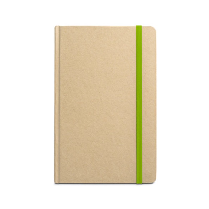 A5 Notizbuch mit 160 linierten Seiten aus recyceltem Papier mit Hardcover aus Karton. Mit Gummiband und Trennband in der gleichen Farbe.