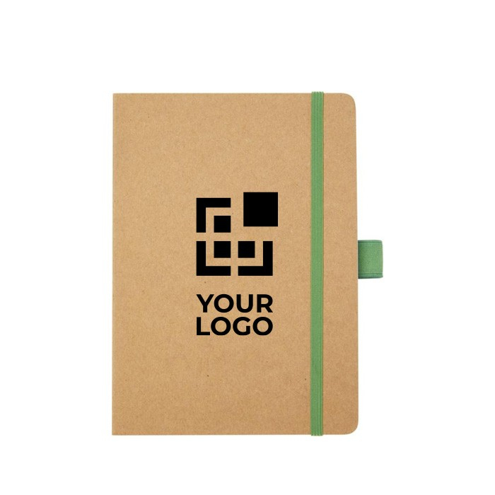 A5-Notizbuch aus liniertem Recyclingpapier (70 g/m²) mit abgerundeten Ecken, farbigem Gummiband und Stifthalter.