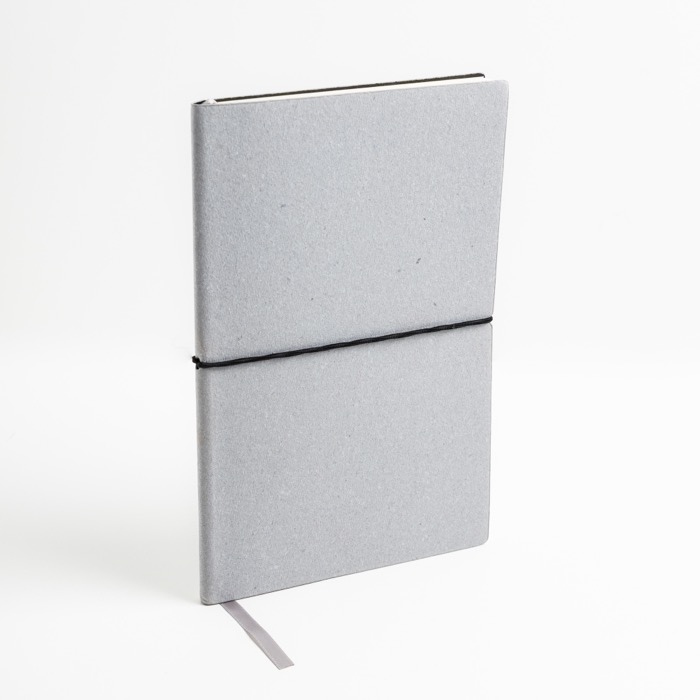 Verschenken Sie einen A5-Notizblock mit einem Einband aus recyceltem Leder, horizontalem Gummiband und 160 gepunkteten Seiten.