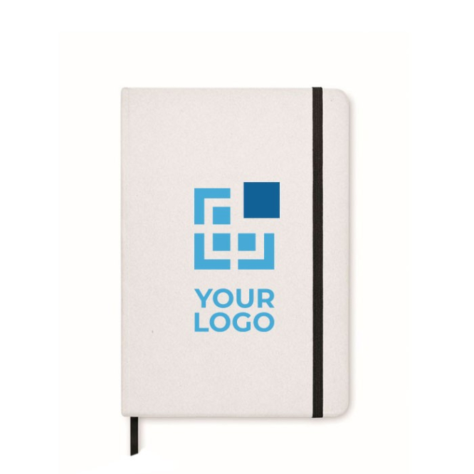 Nachhaltige Notizbücher bedrucken für Firmen mit Einband aus recyceltem Karton, Steinpapier, Verschlussband und Lesezeichen. Werben Sie mit Ihrem Logo!