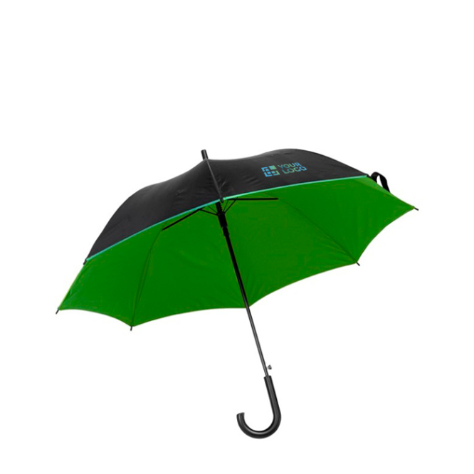 Automatischer Regenschirm, der innen bunt und außen elegant schwarz ist. Der Kunststoffgriff und die Metallstäbe sorgen für zusätzliche Widerstandsfähigkeit.
