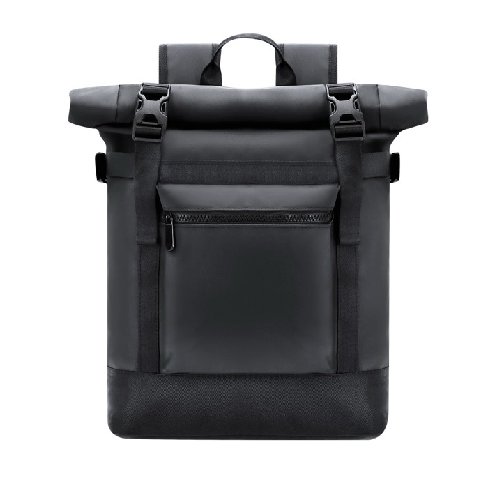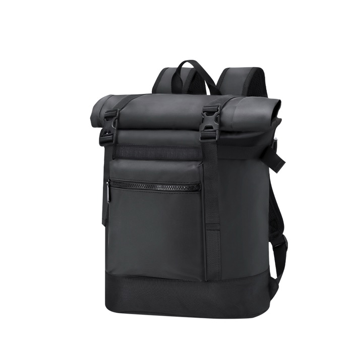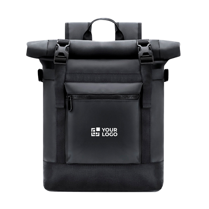 Kunststoffrucksack mit Rolltop-Verschluss und Schnallen, für den Alltag und unterwegs. Mit einer Außentasche mit Reißverschluss für schnellen Zugriff und einem geräumigen Innenfach mit gepolstertem Fach für Laptops bis 15" sowie ein Tablet mit 10". Verstellbare seitliche Riemen helfen, das Volumen je nach Beladung zu komprimieren. Schulterriemen aus Kunstleder und gepolsterte Rückseite für mehr Tragekomfort. Mit rückseitigem Band zur Befestigung am Trolley, praktisch für Geschäftsreisen, Messen und Kundenbesuche.