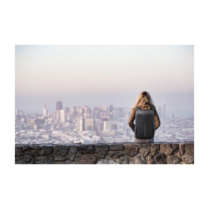 Diebstahlsicherer Rucksack, wasserabweisend, mit reflektierenden Details. TSA-Schloss, versteckte Taschen, gepolstertes Laptopfach (15,6'') + Tabletfach (10''), Flaschenöffner-Schnalle, USB-Port. Gepolsterter Rücken, Anti-Diebstahl-Reißverschlüsse