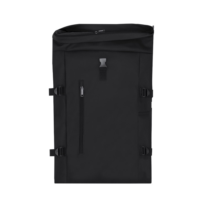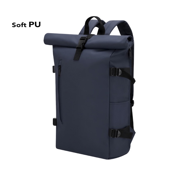 Rucksack aus weichem PU mit Rolltop-Verschluss, Reißverschluss und Schnalle. Mit einer Fronttasche und einer seitlich zugänglichen Rückentasche, beide mit verdeckten Reißverschlüssen, sowie zwei zusätzlichen Seitentaschen. Großes Hauptfach mit gepolstertem Laptopfach für Geräte bis 15 Zoll. Verstellbare Seitengurte zur Volumenanpassung, gepolsterte Schultergurte und Rückenpartie aus PU für hohen Tragekomfort. Mit Brustgurt und Schnalle für sicheren Sitz sowie rückseitigem Gurt zur Befestigung an Trolleys – ideal für Reisen.