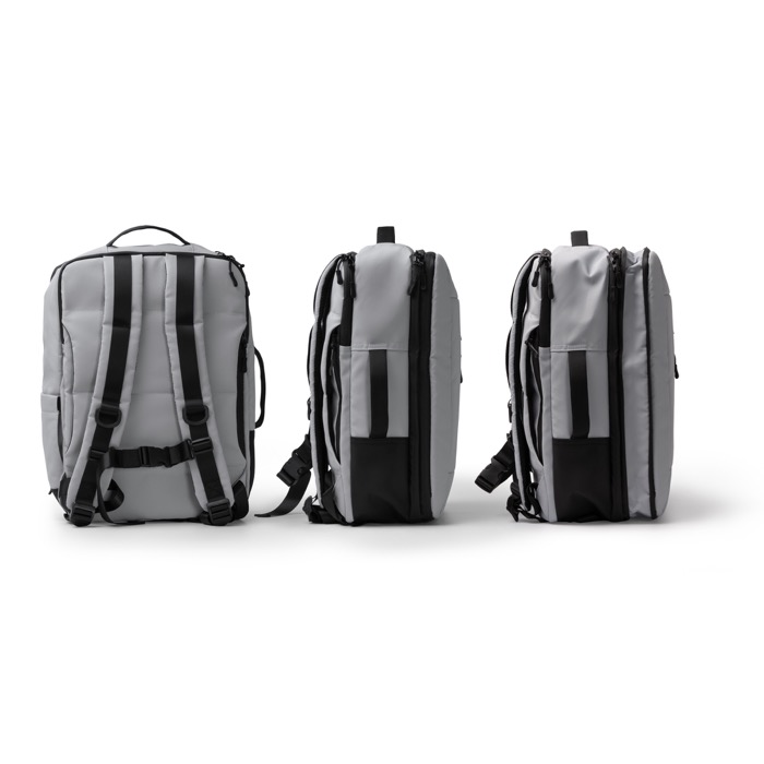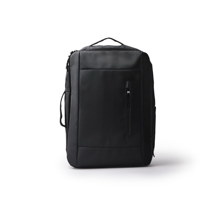 Laptop Rucksack aus RPET Polyester mit Koffergurt