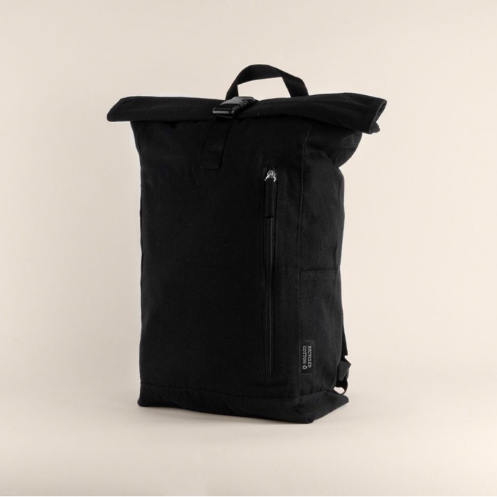 Lassen Sie diesen Rolltop-Rucksack aus recyceltem Canvas als Werbemittel bedrucken. Es hat einen seitlichen Reißverschluss und Innenfach für den Laptop.