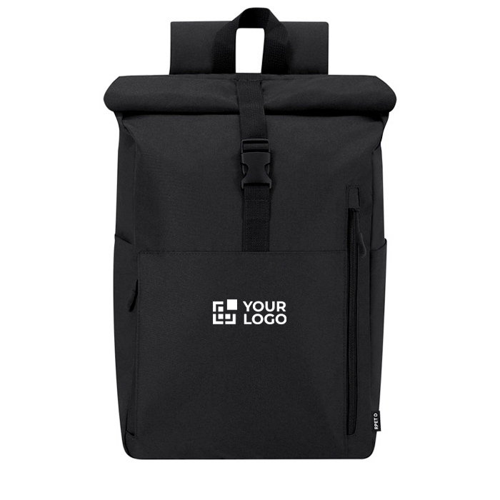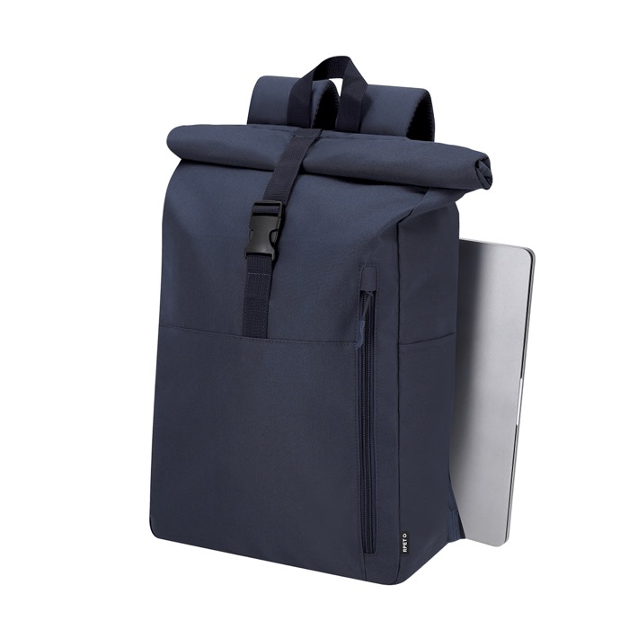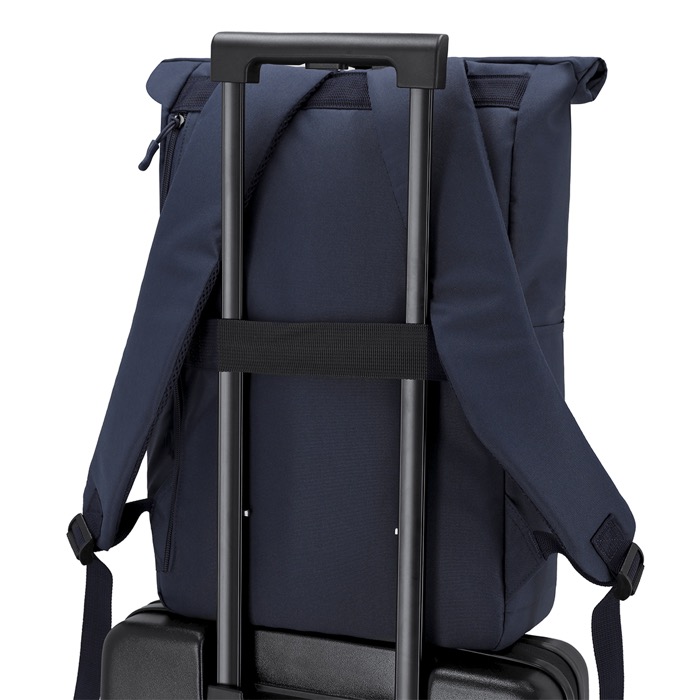 Rucksack aus strapazierfähigem RPET 300D mit Rolltop-Verschluss und Schnalle. Zwei Fronttaschen, eine seitlich zugängliche Rückentasche und zwei zusätzliche Seitentaschen. Großes Hauptfach mit gepolstertem Laptopfach für Geräte bis 15 Zoll. Gepolsterte Schultergurte und Rückenpartie. Mit Befestigungsgurt zur Anbringung am Trolley – ideal für Reisen.