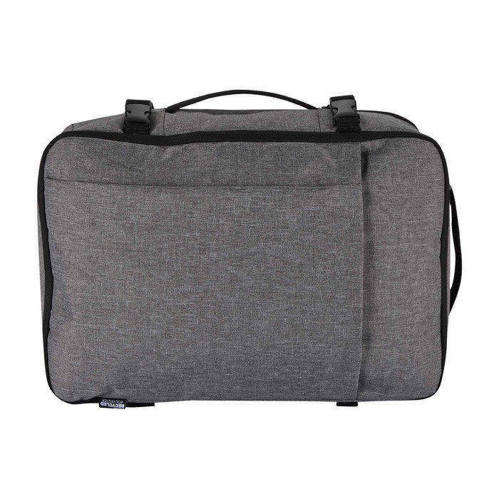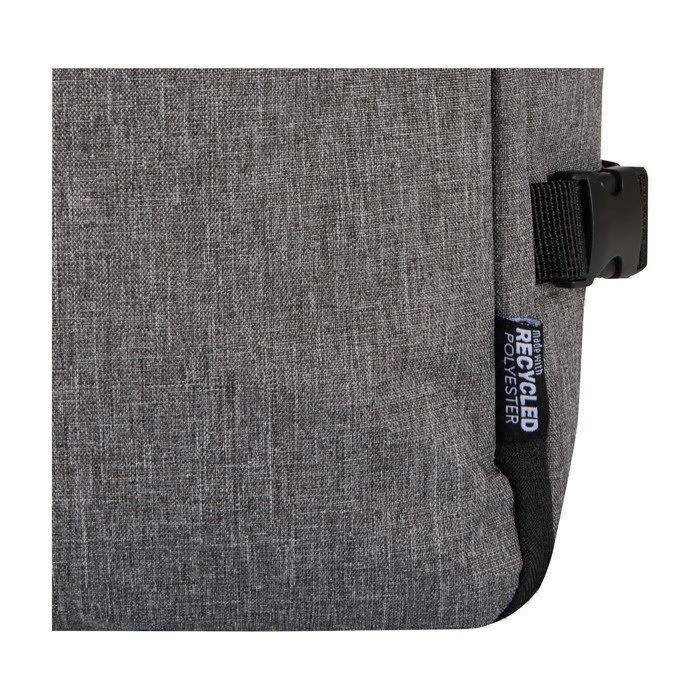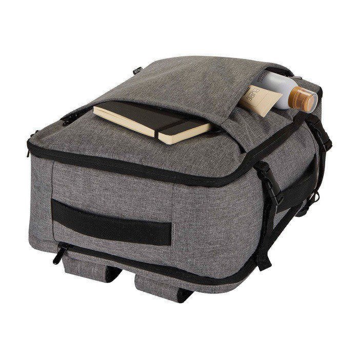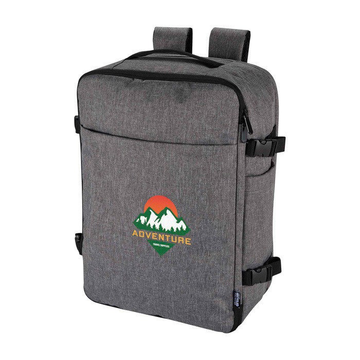 Rucksack aus recyceltem Polyester mit GRS-Zertifikat (Global Recycled Standard) und Futter aus recyceltem Kunststoff, entwickelt für Reisen als Handgepäck bei den meisten Fluggesellschaften. Er verfügt über ein Laptopfach für bis zu 17 Zoll sowie ein geräumiges Hauptfach mit elastischen Riemen und Netztrennwänden zur Organisation von Kleidung und Zubehör. Zusätzlich bietet er zwei Fronttaschen mit Reißverschluss für das Wichtigste, ein atmungsaktives Rückenteil und eine Schlaufe zur Befestigung am Koffer. Praktisch für Geschäftsreisen, Arbeiten im Homeoffice oder Unternehmensveranstaltungen.