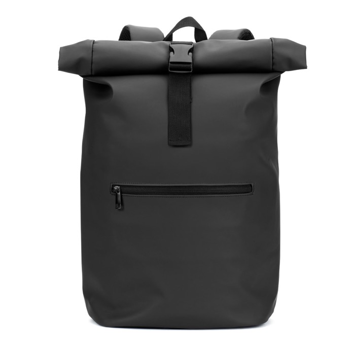Rolltop-Rucksack aus Kunstleder mit Innenfutter aus Polyester 210D, konzipiert für den täglichen Einsatz im beruflichen Umfeld. Der Rolltop-Verschluss ermöglicht es Ihnen, das Volumen je nach Bedarf anzupassen und dabei ein kompaktes Format beizubehalten. Er verfügt über ein Laptopfach für 16" sowie ein Hauptfach zur Organisation von Dokumenten und Zubehör. Die Fronttasche mit Reißverschluss erleichtert den Zugriff auf kleine Gegenstände. Das gepolsterte Rückenteil erhöht den Tragekomfort und enthält eine Trolley-Schlaufe, praktisch auf Geschäftsreisen und bei Firmenveranstaltungen.