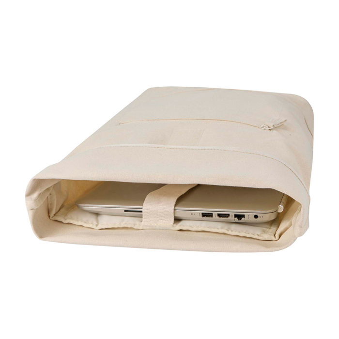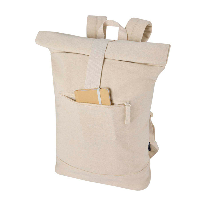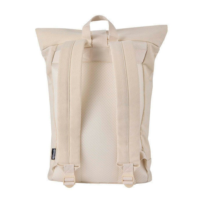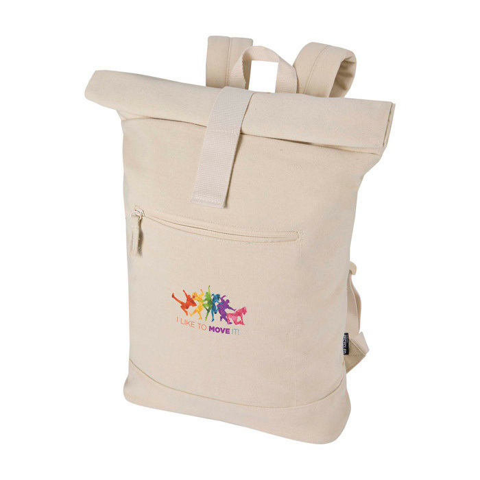 Wasserabweisender Rucksack aus recyceltem Canvas mit passendem Futter aus recyceltem Kunststoff, ausgelegt für einen vielseitigen täglichen Einsatz. Er verfügt über ein gepolstertes Fach für Laptops bis 14 Zoll, eine Fronttasche mit Reißverschluss und ein atmungsaktives Rückenpolster aus Mesh, das beim Tragen mehr Komfort bietet. Der obere Rolltop-Verschluss ermöglicht es, das Volumen je nach Transportbedarf zu erweitern und den Inhalt zugleich geschützt und gut erreichbar zu halten. Eine praktische Option für Wege im Alltag, Geschäftsreisen und Markenauftritte bei Firmenveranstaltungen.
