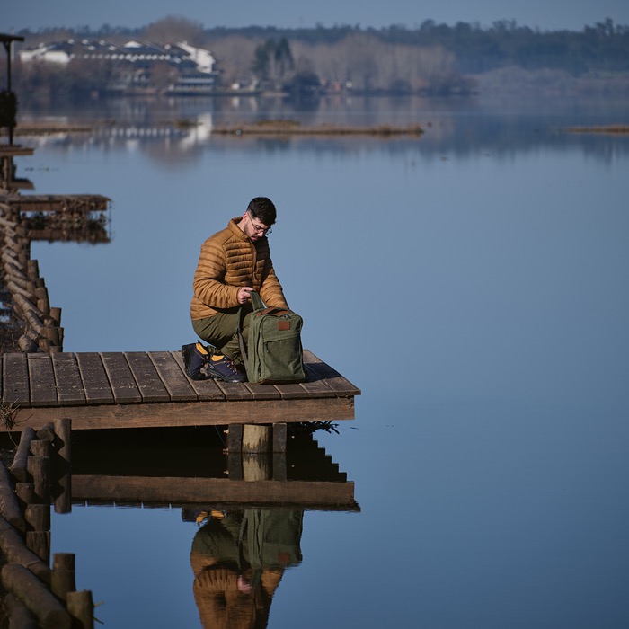 Unser 27L Rucksack ist aus 230 g/m2 recycelter Baumwolle mit Wachsbeschichtung hergestellt. Mit zwei Hauptfächern, eine versteckte Vordertasche und eine kleine Tasche mit Reißverschluss hinter dem oberen Tragegriff. Im Inneren finden Sie ein gepolstertes Laptop-Fach. Mit einer individuellen recycelten Baumwolltasche.