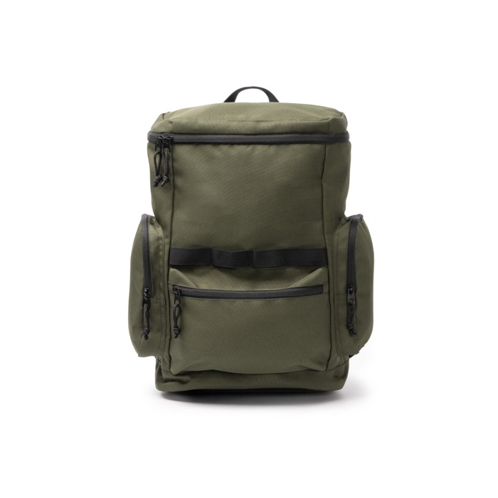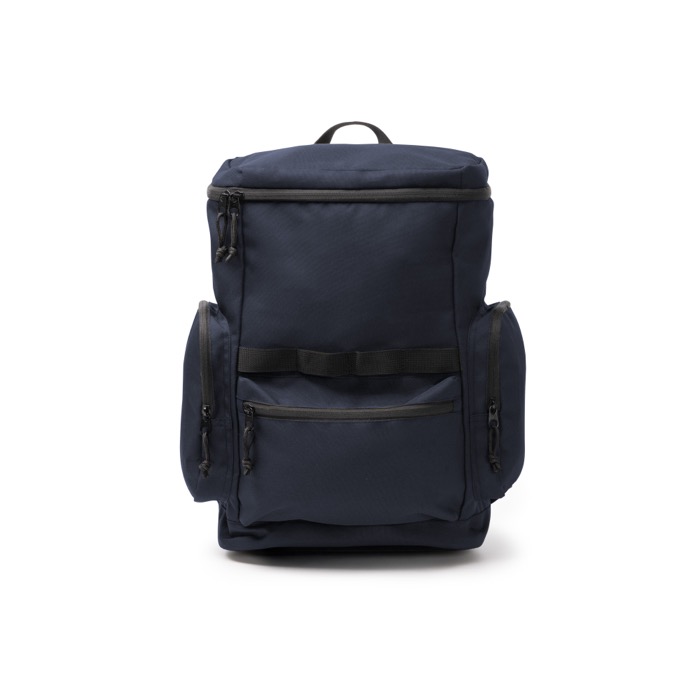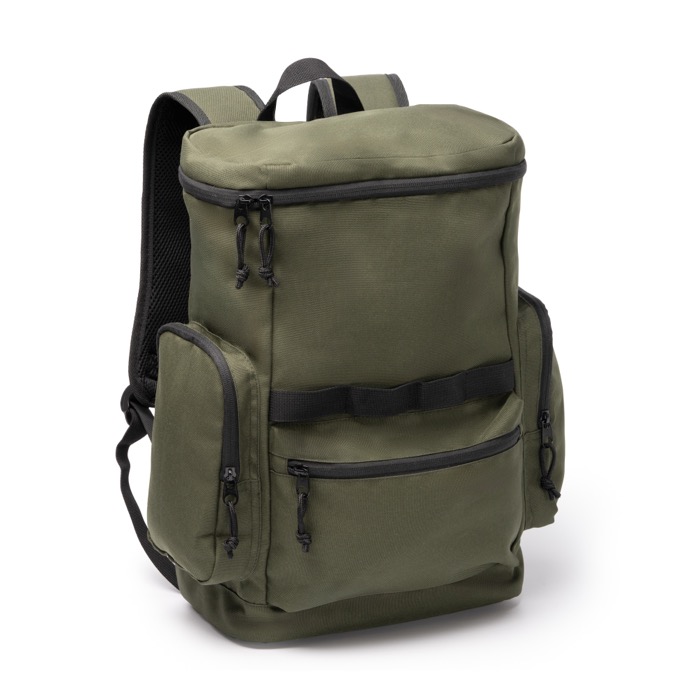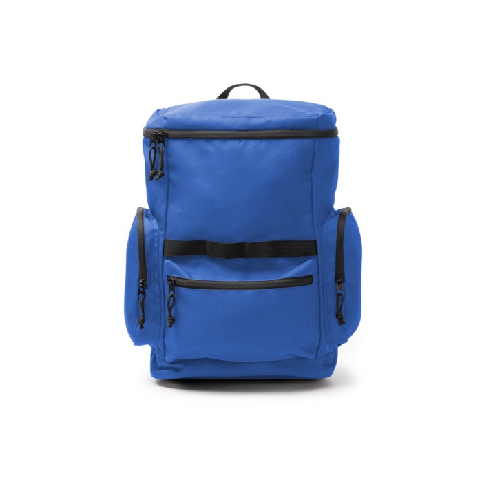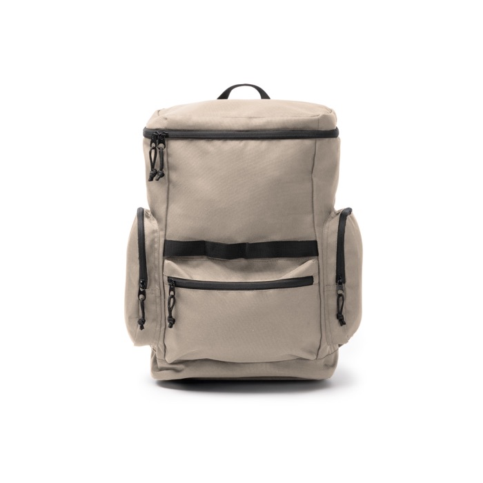Rucksack aus recyceltem RPET-600D-Kunststoff mit Öffnung an der Oberseite für schnellen Zugriff auf den Inhalt. Er verfügt über seitliche Außentaschen sowie eine Fronttasche mit Reißverschluss und schwarzen Zippern, um Gegenstände des täglichen Gebrauchs zu organisieren. Mehrere Befestigungspunkte ermöglichen das Anbringen von Zubehör je nach Aktivität. Innen befindet sich ein elastisches Fach für Geräte bis zu 12". Gepolsterter Rücken und gepolsterte Träger sorgen für komfortable Nutzung auf Reisen und bei Unternehmensveranstaltungen.