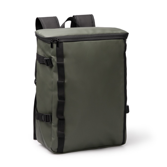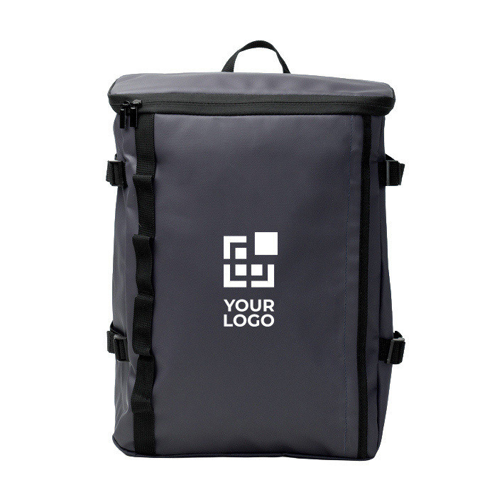 Rucksack aus Kunstleder und 600D-Polyester, konzipiert für den Unternehmensalltag. Er verfügt über ein geräumiges Hauptfach mit Reißverschluss und gefüttertem oberen Bereich sowie ein Innenfach mit elastischer Fixierung für einen Laptop bis 16". Ein unsichtbares Frontfach ermöglicht das diskrete Verstauen von Gegenständen. Sechs seitliche Befestigungspunkte und Verstellriemen helfen, das Volumen je nach Inhalt anzupassen. Mit Trolley-Schlaufe sowie gepolstertem Rücken und Tragegurten ist er praktisch für Reisen, Veranstaltungen und Unternehmensgeschenke mit Logo.