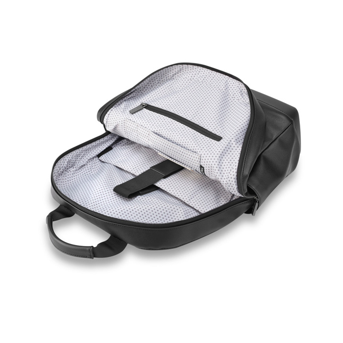 Urbaner Rucksack aus technischem Gewebe, gedacht für den täglichen Rhythmus und unterwegs. Er verfügt über zwei Hauptfächer, davon eines passend für einen Laptop bis 15'' – so transportieren Sie Ihre Ausrüstung besser geschützt und geordnet. Die Rückseite mit atmungsaktivem Netz erhöht den Komfort auf längeren Strecken. Enthält eine Fronttasche mit thermoversiegeltem Verschluss und einen Gurt zur Befestigung am Gepäck. Innen kommen Organizer, Stifthalter und Kartenfach hinzu. Eine praktische Option für Onboarding, Tagungen und Markenaktionen unterwegs.
