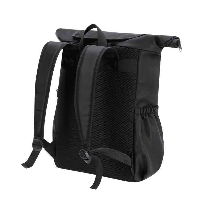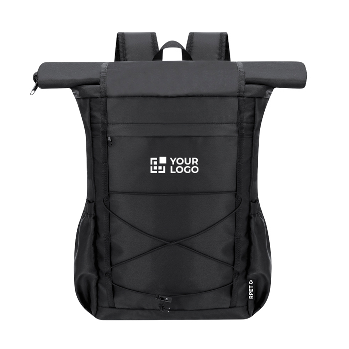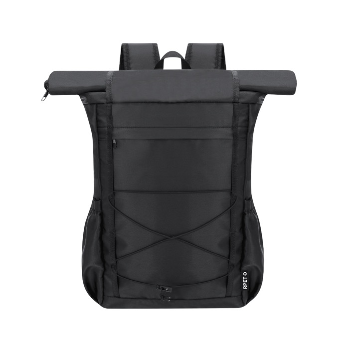 Rucksack aus recyceltem Polyester 290D mit Rolltop-Verschluss, Reißverschluss und einem zweiten Klettverschluss zur Sicherung des Inhalts. Enthält eine Fronttasche mit verdecktem Reißverschluss und eine verstellbare elastische Kordel zum Befestigen einer Jacke oder von Zubehör. Dazu kommen zwei Seitentaschen für Flaschen oder schnell erreichbare Gegenstände. Der Innenraum bietet viel Stauraum und verfügt über ein gepolstertes Fach für Laptops bis 15 Zoll sowie ein gepolstertes Rückenteil und gepolsterte Schultergurte für den täglichen Gebrauch. Empfehlenswert für Willkommensaktionen, Messen oder ein internes Team mit Logo.