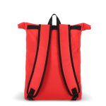 Bequemer Rolltop-Rucksack für Mitarbeiter aus recyceltem Kunststoff mit gepolsterten, verstellbaren Trägern, einer oberen Trageschlaufe und einer Fronttasche.