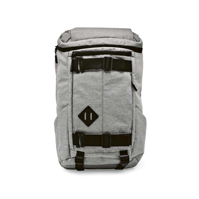 Rucksack im ökologischen Design. Hervorzuheben sind die versteckten Taschen mit seitlichem Zugriff. Er kann an einen Trolley befestigt werden.