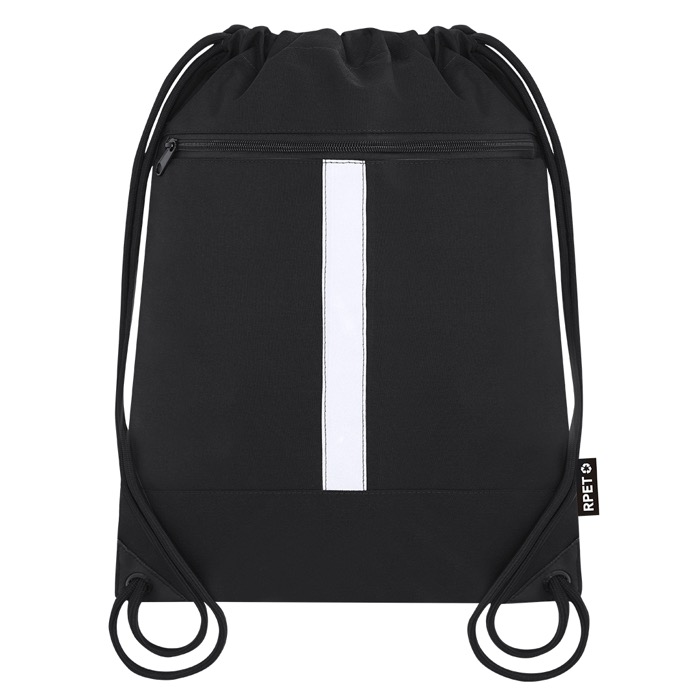 Kordelzugrucksack aus recyceltem Polyester mit reflektierendem Frontstreifen, gedacht für eine einfache und bequeme tägliche Nutzung. Mit Fronttasche, um Schlüssel, Handy oder Ausweise getrennt aufzubewahren, sowie schwarzem Kordelzugverschluss, der ein schnelles Öffnen und Schließen ermöglicht. Verstärkte Ecken mit Metallösen erhöhen die Widerstandsfähigkeit bei intensiver Nutzung und unterwegs. Das reflektierende Band sorgt für zusätzliche Sichtbarkeit in städtischer Umgebung. Praktische Option für Markenaktionen bei Veranstaltungen, Messen oder zur Begrüssung von Mitarbeitern.