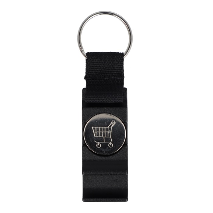 Multifunktionaler Schlüsselanhänger mit Öffner, Handyhalter und Einkaufswagenchip. Ein cleveres Gadget, das Nutzen und Stil für Kunden vereint.