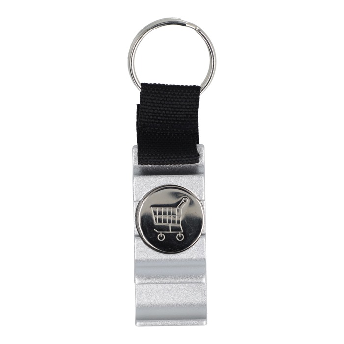 3-in-1-Schlüsselanhänger aus Aluminium mit Flaschenöffner, Handyhalterung und abnehmbarer Münze für Trolleys, kompatibel mit den meisten Trolleys in Westeuropa. Ein kompaktes und praktisches Werbeartikel.