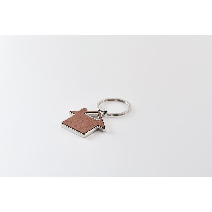 Metallschlüsselanhänger in Hausform mit Kunstledereinsatz