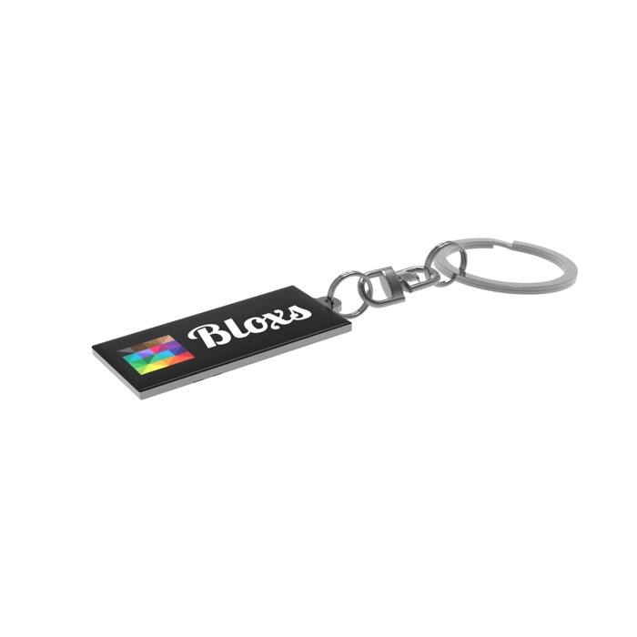 Metallschlüsselanhänger in rechteckiger Form mit beidseitigem Vollfarbdruck, sodass Ihre Marke im Alltag von Kunden und Mitarbeitenden jederzeit präsent bleibt.
