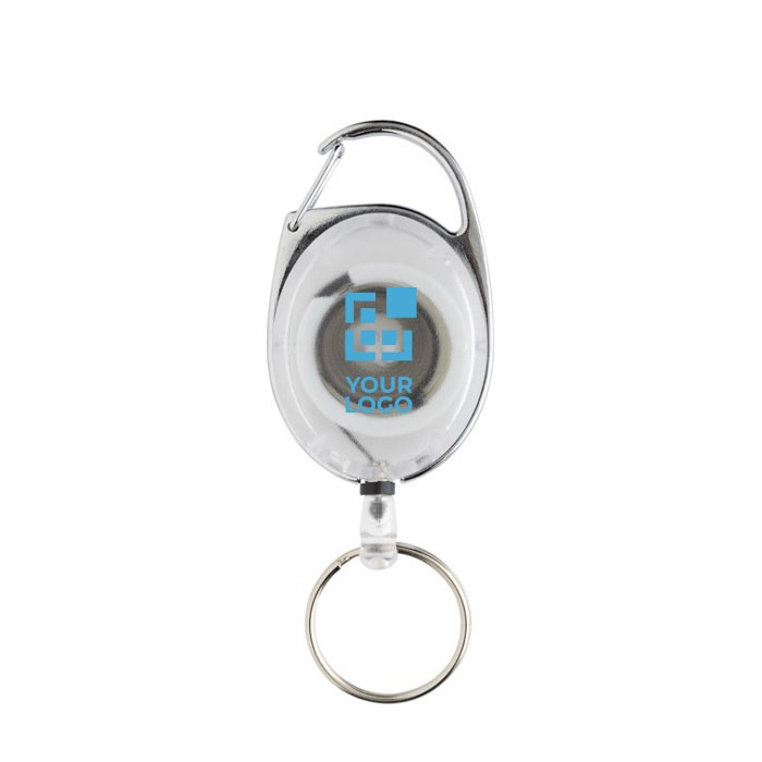 Roller-Clip Schlüsselanhänger aus RCS recyceltem ABS und Zinklegierung. Idealer Artikel für Büro, Messe oder sogar beim Skifahren. Mit 60 cm Kordel zur Befestigung des Ausweises. Mit Karabinerhaken zur Befestigung an Tasche oder Kleidung. Gesamter recycelter Inhalt: 34% basierend auf dem Gesamtgewicht des Artikels. Die RCS-Zertifizierung gewährleistet eine vollständig zertifizierte Lieferkette der recycelten Materialien. Verpackt in Papiertüte