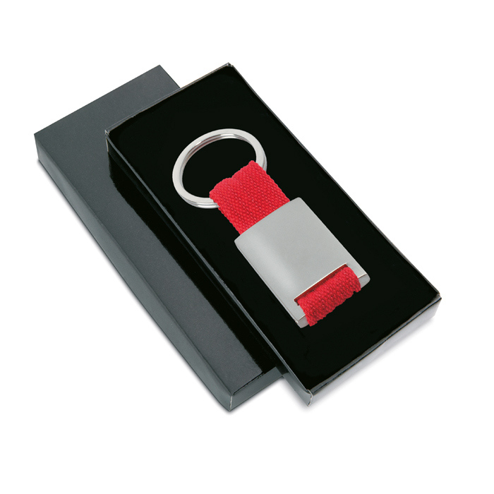 - Rechteckiger Metallschlüsselanhänger mit farbigem Polyesterstreifen