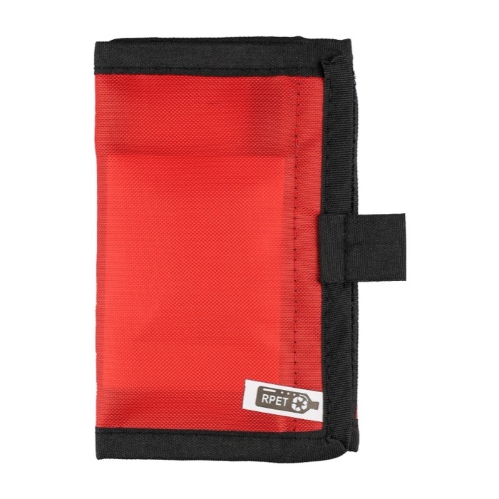Erste-Hilfe-Set aus recyceltem Kunststoffpolyester (rPET) 600D mit Klettverschluss und Tragegriff, um es zwischen Besprechungsraum, Lager oder Fahrzeug zu transportieren. Innenfächer aus Kunststoff (PVC) helfen, den Inhalt zu ordnen. Enthält 17 Teile: 5 Pflaster, 1 sterile Wundauflage, 1 Vlieskompresse, 8 Alkoholtücher und 2 Reinigungstücher. Praktische Option für Präventionsmassnahmen, Schulungen und die Ausstattung von Unternehmen.
