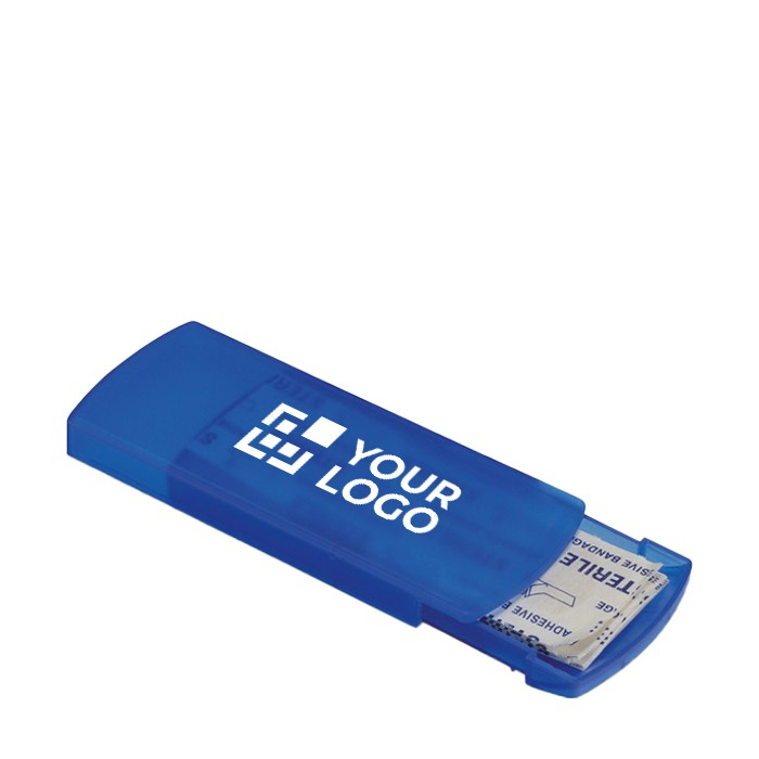 Diese Kunststoffbox enthält fünf Pflaster und kann mit Ihrem Firmenlogo als Werbegeschenk oder Werbeartikel bedruckt werden.