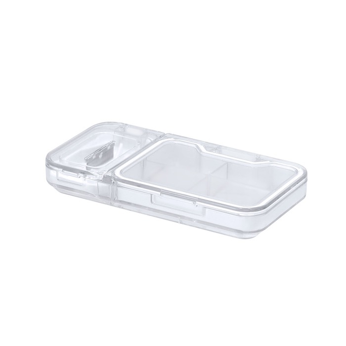 Pillenbehälter mit 4 Innenfächern, Sicherheitsverschluss mit Silikonrändern und Klinge zum Teilen von Pillen. Hergestellt mit einer transparenten Oberfläche.